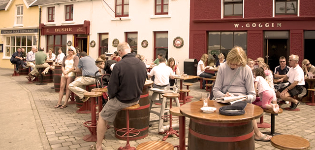 Bushes Bar is situated in the charming village of Baltimore on the south west coast of Ireland. Located in the middle of the Square, overlooking the harbor and islands where there is always a number of activities going on before your eyes. Look out and see boats sailing in the harbor, fishing boats returning, Ferry Boats going to and from the islands, children swimming in the harbor and sometimes even seals swimming between the piers.