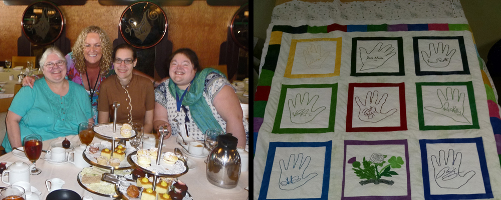 Vicki Hutchison, her daughter Rebecca and her daughters friend also called Rebecca are huge Celtic Thunder fans! They've attended many gigs and last November, even drove 6 hours to see the guys at their Symphony gig in Hershey Pennsylvania! Vicki and the girls also attended the Celtic Thunder 2017 cruise where they attended the afternoon tea event and met Elaine. We are also including a picture of the beautiful quilt that Vicki made with some help from Rebecca before going on the cruise there was a pre cruise party that the quilt was raffled at for charity. The hand prints are all from Celtic Thunder members and the color around each hand print is the person’s favorite color.